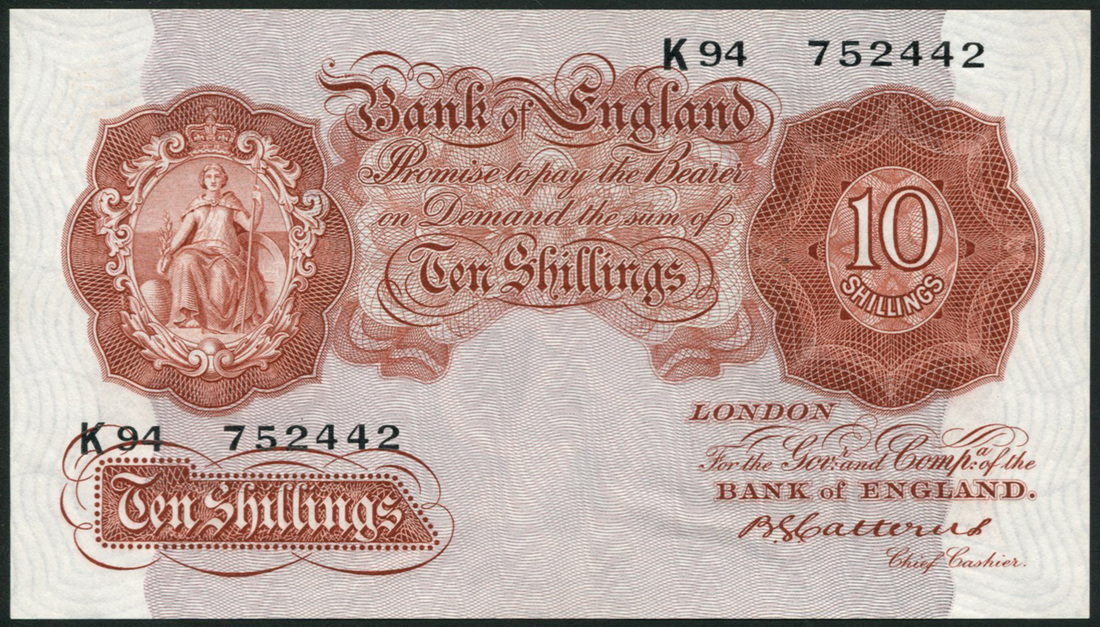 Bank of England, B G Catterns, 10/-, ND (1930), serial number K 94 752442, red, Britannia at left, value at right and in tablet at low left