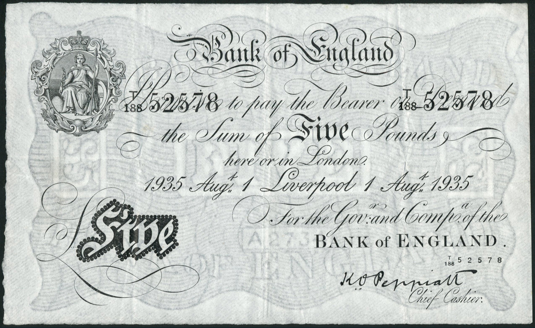 Bank of England, K O Peppiatt, £5, 1 August 1935, Liverpool, serial number T188 52578, black and white, seated Britannia in ornate circular frame at top left, value in black tablet low left