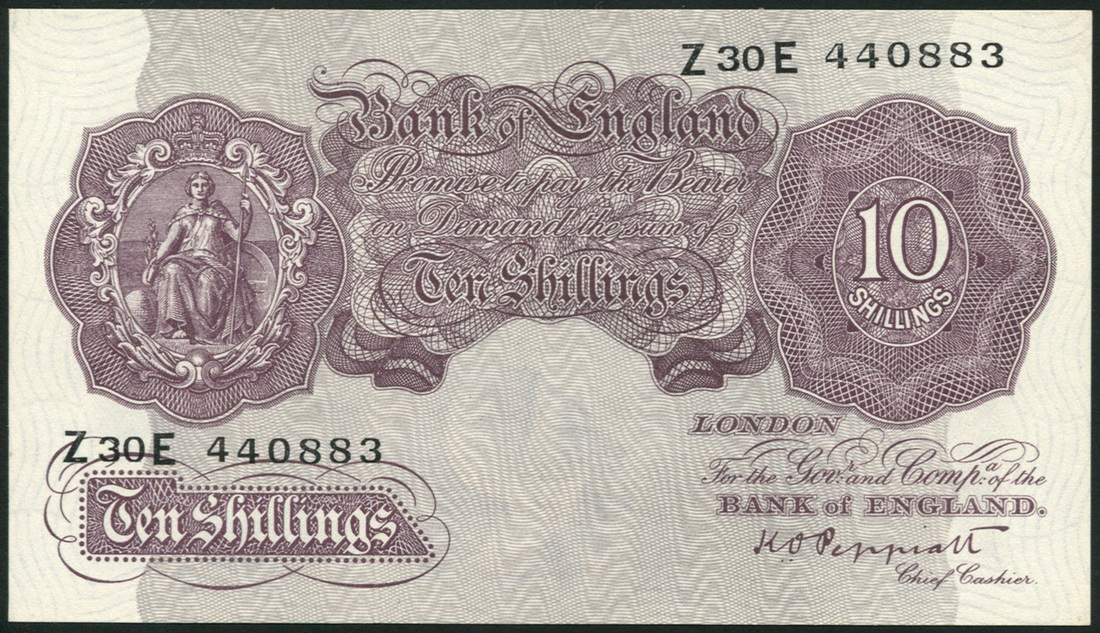 Bank of England, K O Peppiatt, emergency issue 10 shillings, ND (1940), serial number Z30E 440883, mauve, bank title top centre, seated Britannia in ornate circular frame at left, value in tablet low left, centre and at right