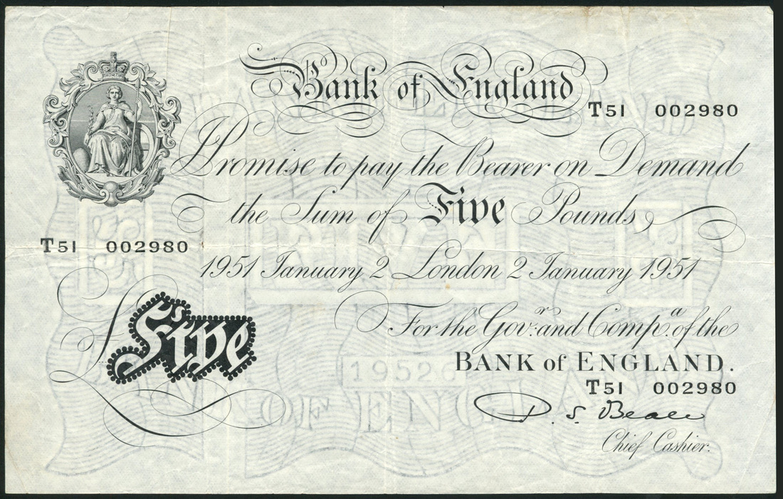 Bank of England, P S Beale, £5 (5), 4 October 1949, serial number O59 006619, 7 September 1950, serial number S51 014931, 2 January 1951, serial number T51 002980, 20 January 1951, serial number T67 086684,