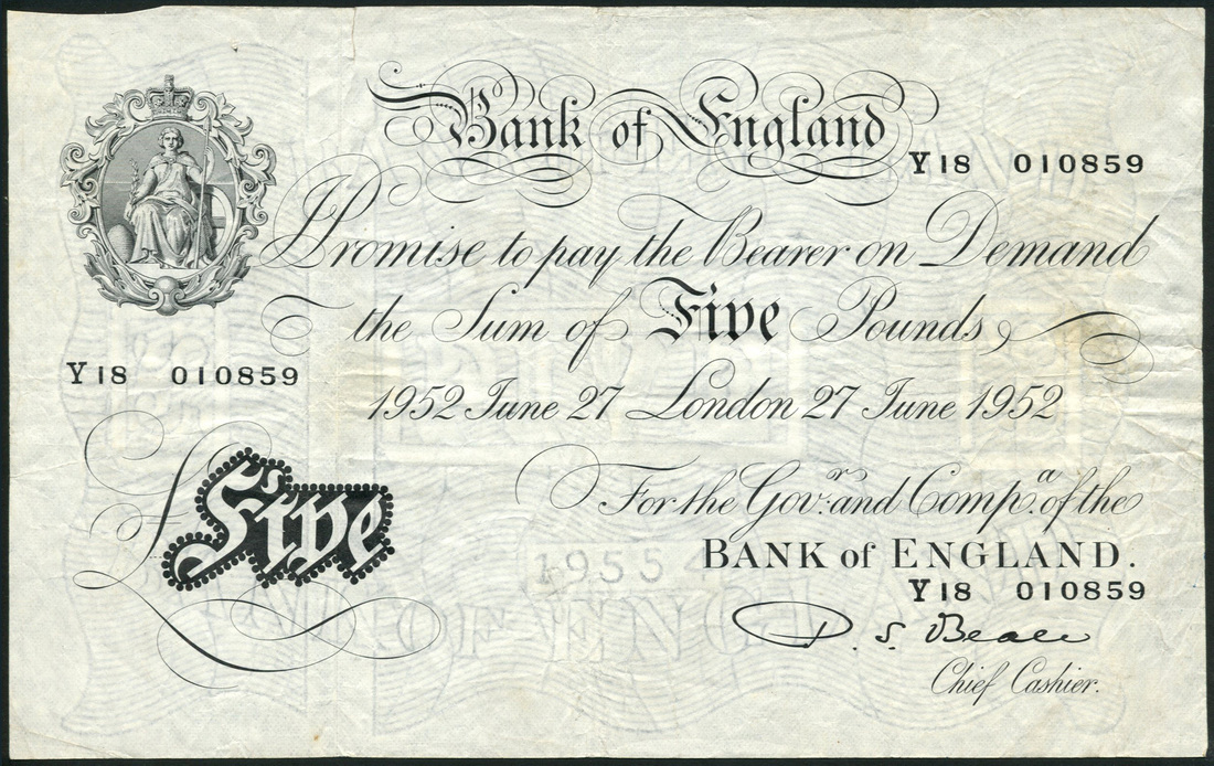 Bank of England, P S Beale, £5, 27 June 1952, serial number Y18 010859, black and white, seated Britannia top left, bank title top centre, value in black tablet low left