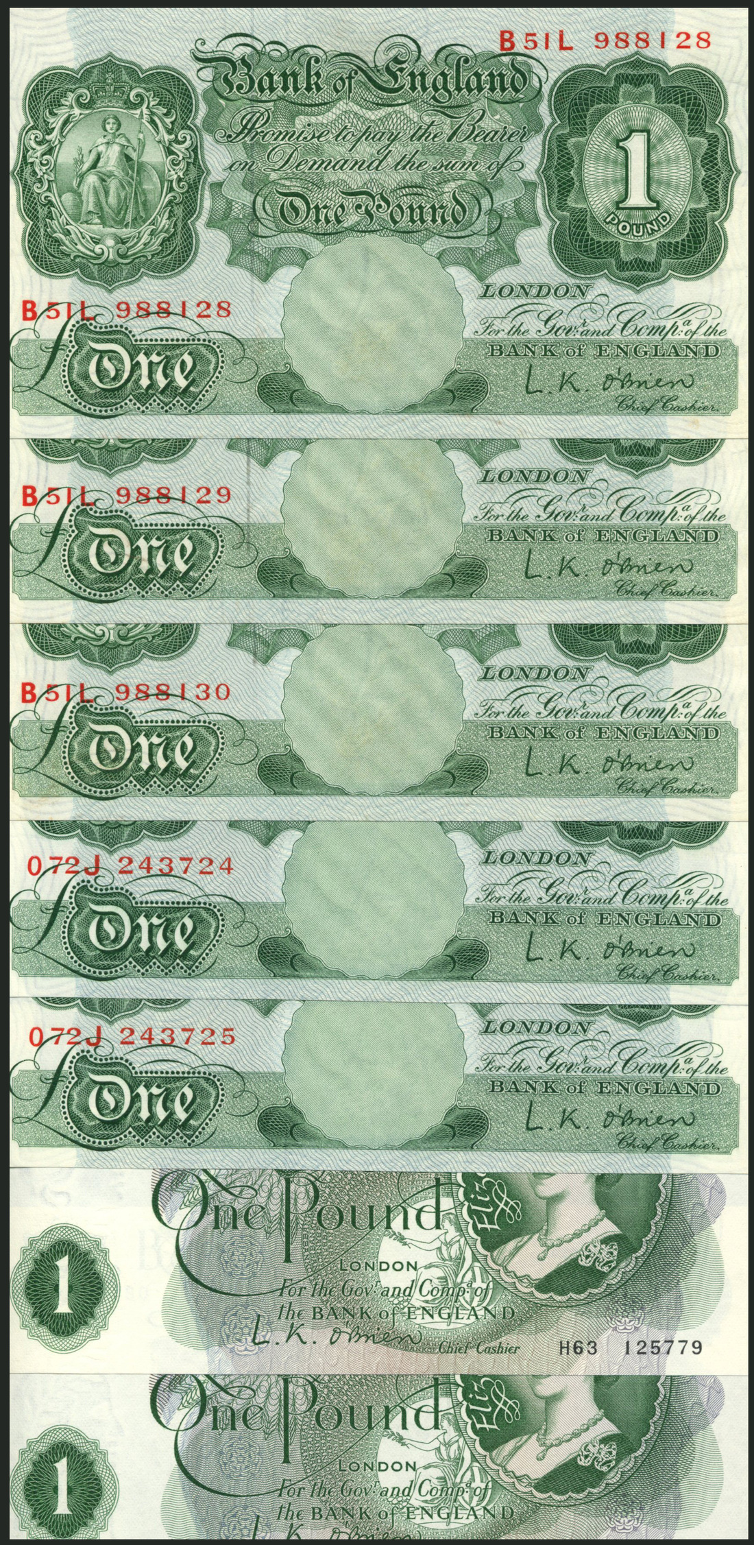 Bank of England, L K O'Brien, £1 (7), ND (21 March 1955 and 17 March 1960), consecutive serial numbers B51L 988128-30, O72J 243724-5, H63 125776-7 and H63 125779-80, green, seated Britannia at left, value in ornate tablets low left and top right, reverse, Parliament building, St George and dragon low left and right, portrait Queen Elizabeth II in circular frame at right, value in green tablets low left and top right, seated Britannia low centre right, reverse, guilloche patterns, respectively