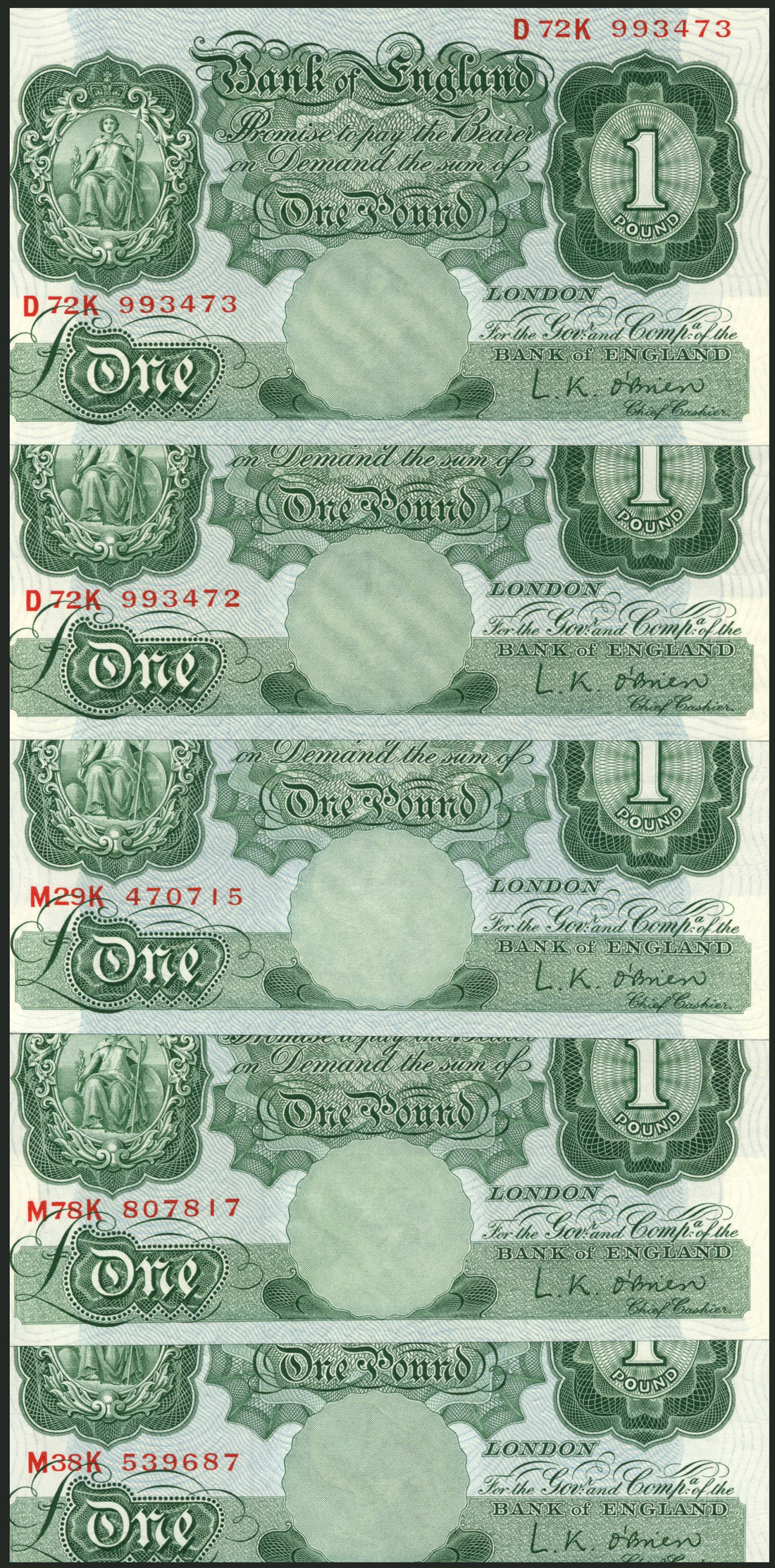 Bank of England, L K O'Brien, £1 (5), ND (21 November 1955), consecutive serial numbers D72K 993472/3 and M38K 539687, MK78 807817, M29K 470715, green, vignette of Britannia top left, bank title top centre, value in ornate frame at right and low left, reverse, Parliament, St George and dragon low left and right