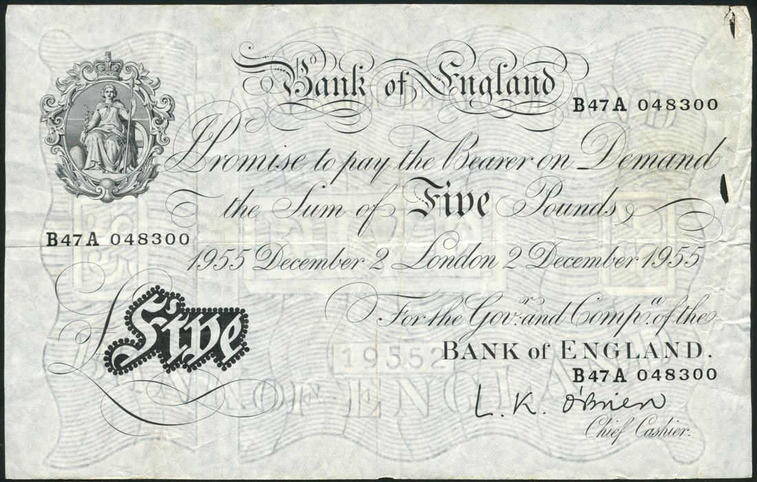 Bank of England, L K O'Brien, £5 (4), 24 March 1955, serial number Z29 048409, 15 August 1955, serial number A52A 000672, 12 October 1955, serial number B03A 083225, 2 December 1955, serial number 2 December 1955, black and white, seated Britannia top left, value n black tablet low left
