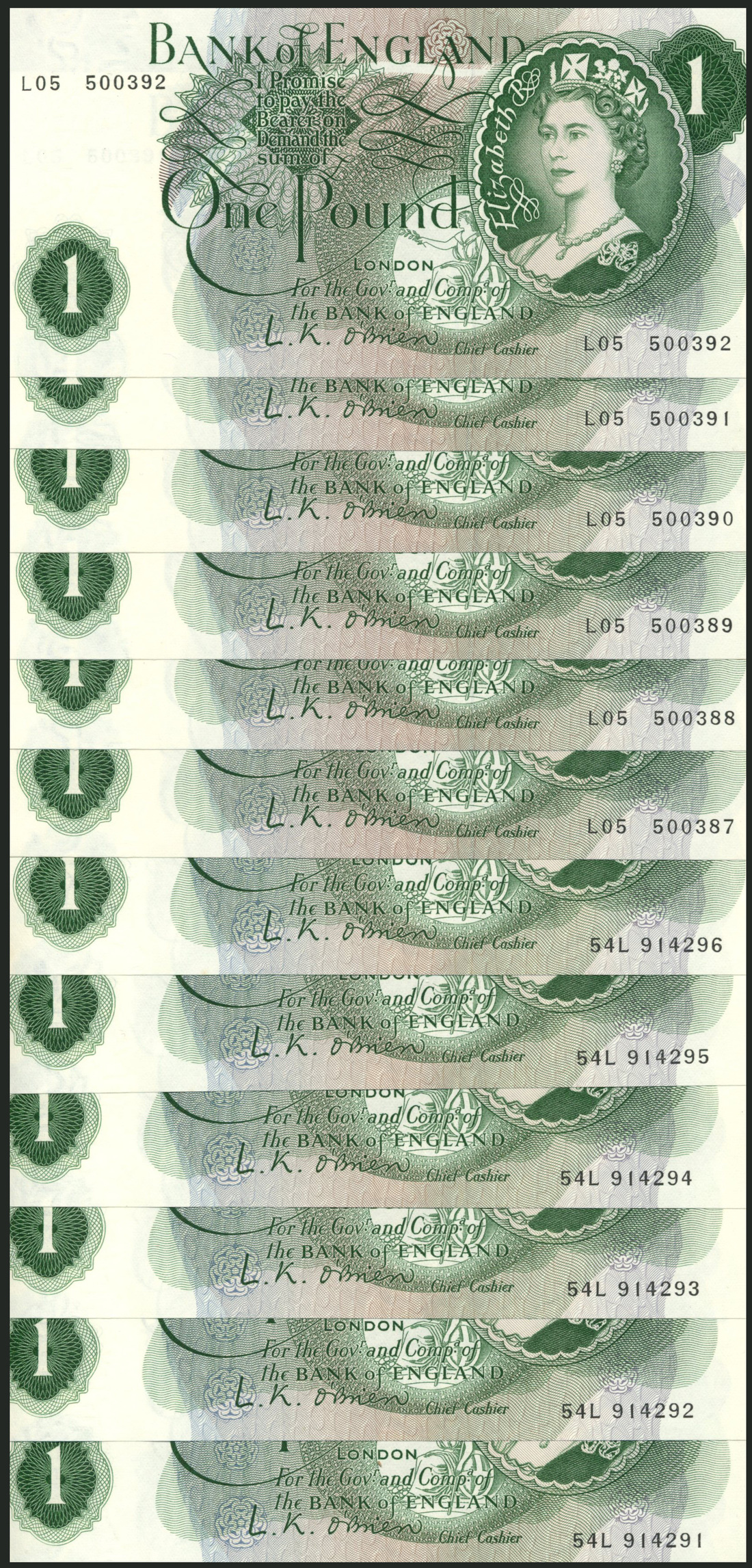 Bank of England, L K O'Brien, £1 (6), ND (17 March 1960), consecutive serial numbers LO5 500387-92, and £1 (7), ND (17 March 1960), consecutive serial numbers 54L 914290-6, green, portrait Queen Elizabeth II at right, value low left, centre and top right, seated Britannia low centre right, reverse, value, bank title and Britannia