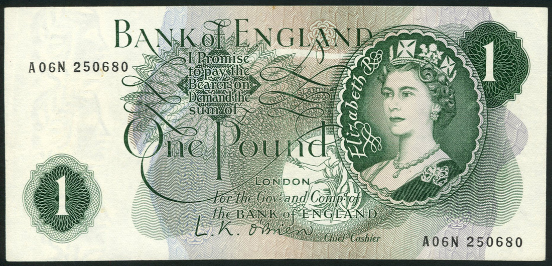 Bank of England, L K O'Brien, £1, ND (1960), serial number A06N 250680, green, bank title top centre, portrait Queen Elizabeth II in ornate circular frame at right, value in tablet low left and top right and at centre