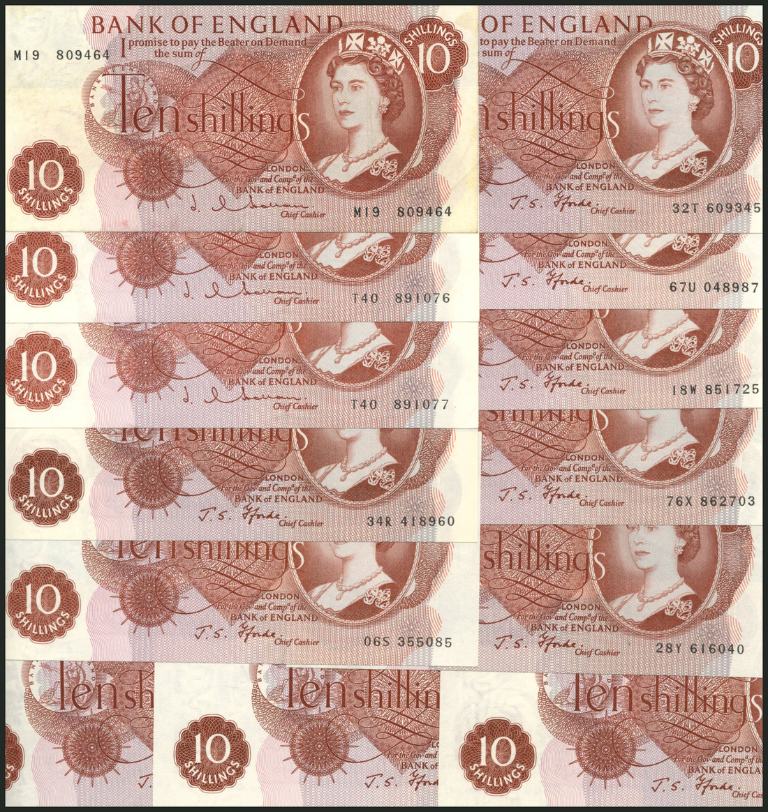 Bank of England, J Q Hollom, 10 shillings (3), ND (1963), consecutive serial numbers T40 891076-7, and M19 809464 (replacement), together with J S Fforde, 10 shillings (10), ND (1967), all russet, portrait Queen Elizabeth II at right, bank title top centre, value low left, centre and top right