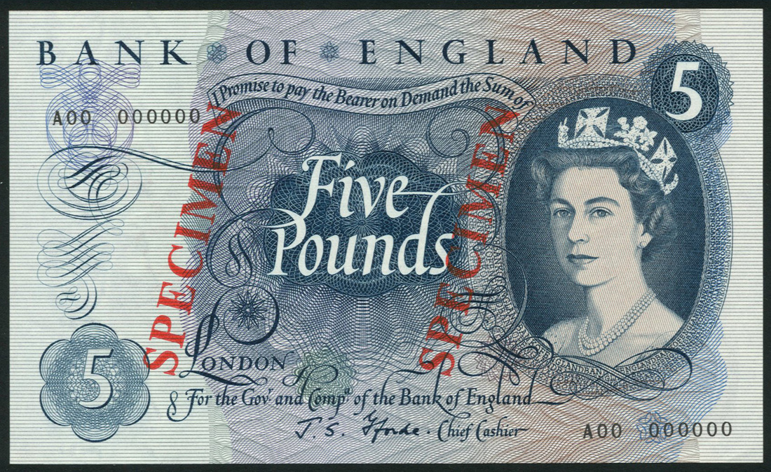 Bank of England, J S Fforde, specimen £5, ND (1967), serial number A00 000000, blue, portrait of Queen Elizabeth II at right, value at top right and low left, reverse blue seated Britannia at centre, red SPECIMEN overprint