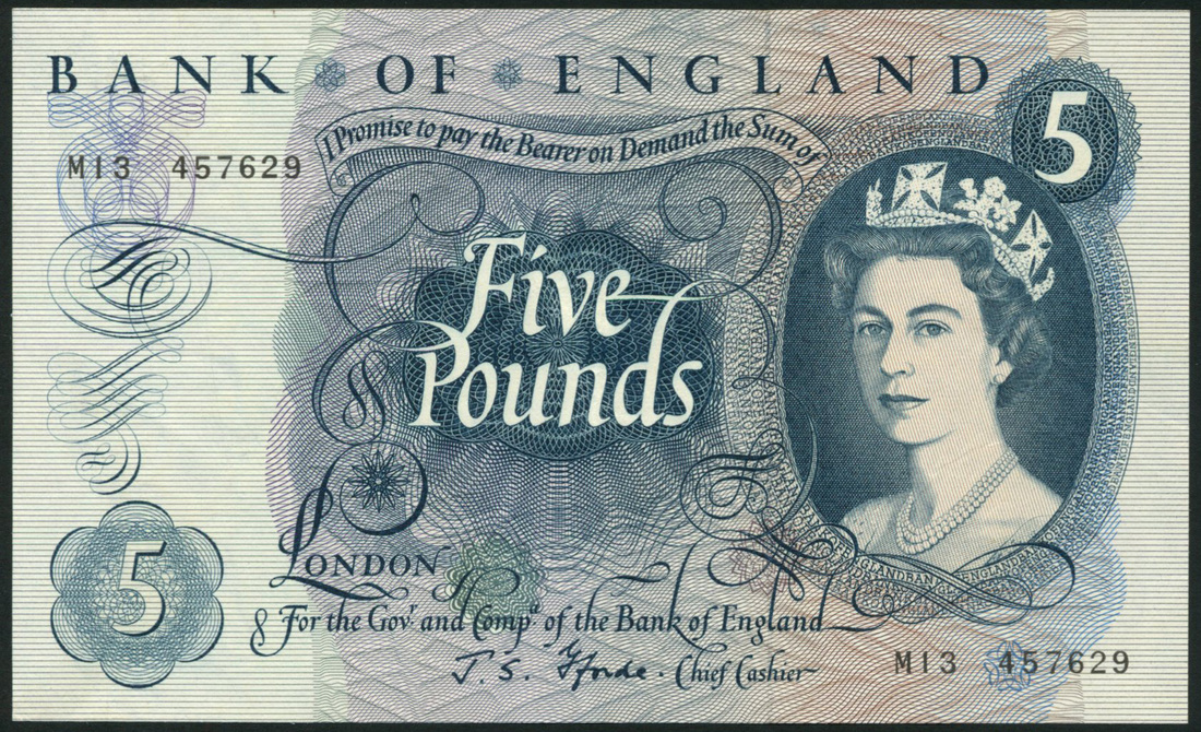 Bank of England, J S Fforde, £5, ND (1967), serial number M13 457629, blue, portrait Queen Elizabeth II at right, bank title top centre left, value at low left, centre and top right, reverse, seated Britannia at centre