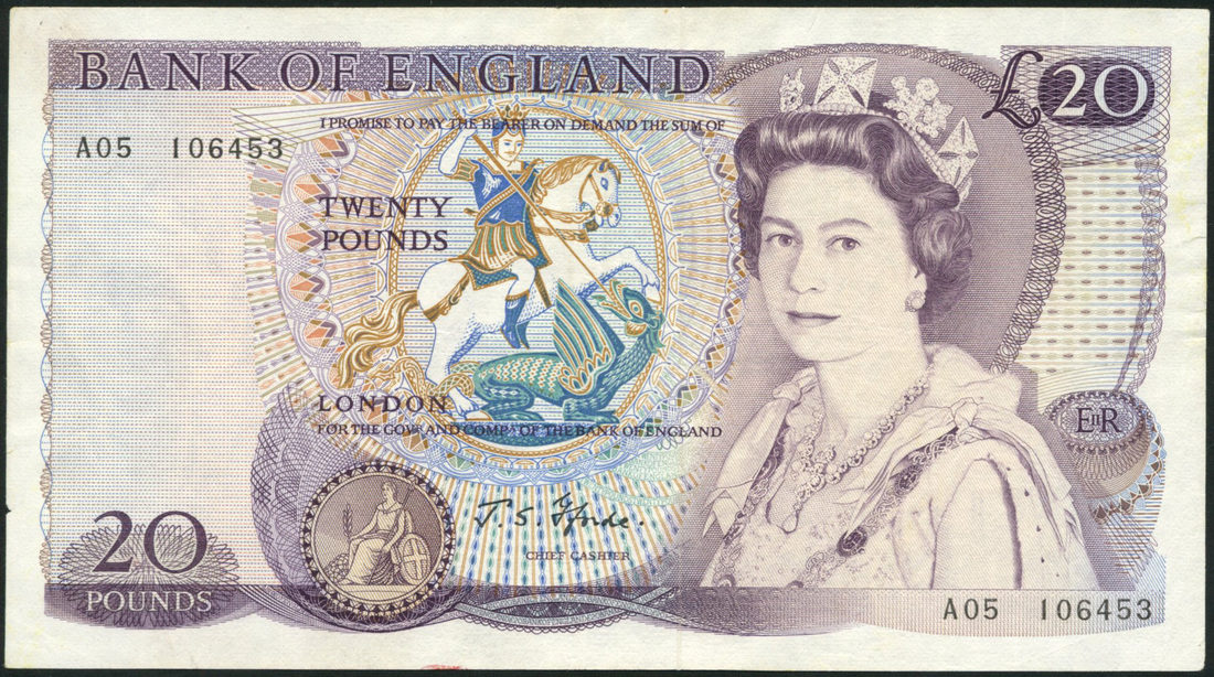 Bank of England, J S Fforde, £20, ND (1970), serial number A05 106453, purple and multicolour, portrait Queen Elizabeth II at right, St George and dragon centre left, seated Britannia below, value low left, top right and at centre, reverse, William Shakespeare