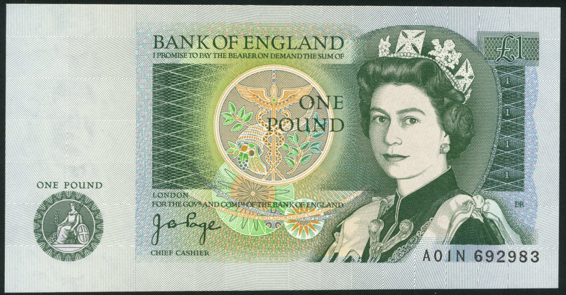 Bank of England, J B Page, £1 (3), ND (1978), serial number M01 623001 (replacement), and two first run notes serial numbers A01N 692832 and A01N 692983, green, portrait Queen Elizabeth II at right, seated Britannia low left, phoenix rising from flames at centre, reverse, Sir Isaac Newton