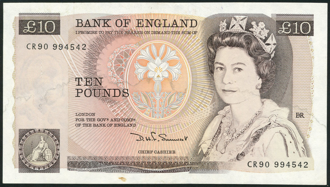 Bank of England, D H F Somerset, £10, ND (1987), serial number CR90 994542, brown and light orange, portrait Queen Elizabeth II at right, seated Britannia low left, bank title top centre left, value top right, left and at centre, reverse, Florence Nightingale