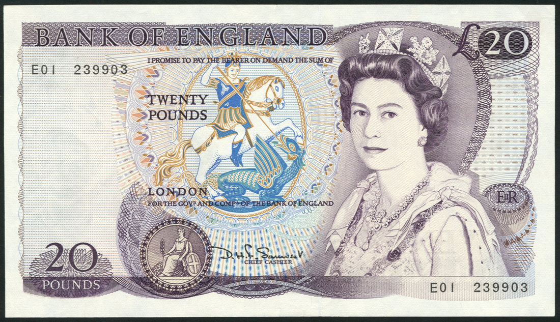 Bank of England, D H F Somerset, £20, ND (1981), serial number E01 239903, purple and multicolour, portrait Queen Elizabeth II at right, St George and dragon centre left with seated Britannia below, reverse, William Shakespeare