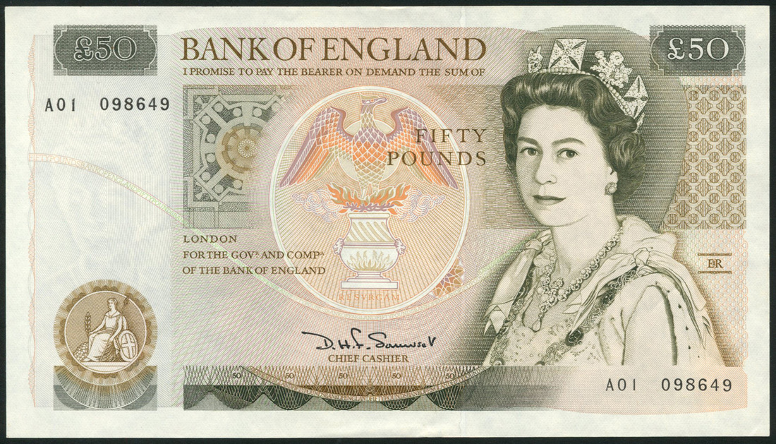 Bank of England, D H F Somerset, £50, ND (1981), serial number A01 098649, olive green on multicolour underprint, portrait Queen Elizabeth II at right, phoenix rising from flames at centre, seated Britannia low left, reverse, Sir Christopher Wren