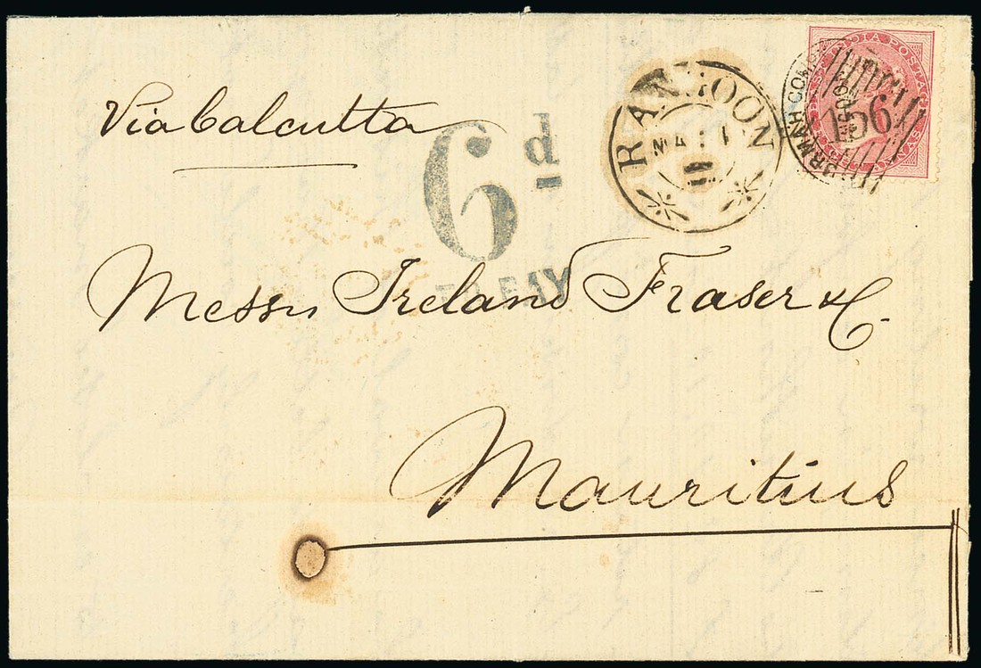 1866 (11 Mar.) entire letter from Rangoon to Mauritius, marked "Via Calcutta", bearing De La Rue 8a. carmine tied by firm's chop and clear "rangoon/156" (Type KD9), showing "6d/to pay" h.s. alongside with Calcutta and arrival (24.5) datestamps on reverse. Attractive. Photo