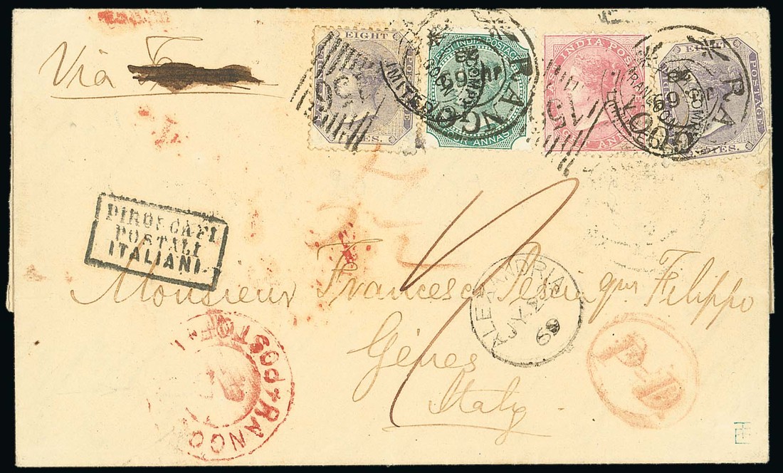 1869 (21 June) entire letter ex the "Pescia" correspondence to Genoa, bearing De La Rue 8p. mauve (2), 4a, green and 8a. pale carmine, all with firm's chop and tied by "rangoon/156" (Type KD9), showing manuscript "1/-", red crayon "5½", the very rare "rangoon/p.d./post office" circular h.s. in red, oval-framed "p-d", framed "piroscafi/postali/italiani", Alexandria (British P.O.) transit c.d.s. (23.7) and, on reverse, Calcutta, Brindisi and arrival (30.7) datestamps. A rare and most delightful cover. Photo