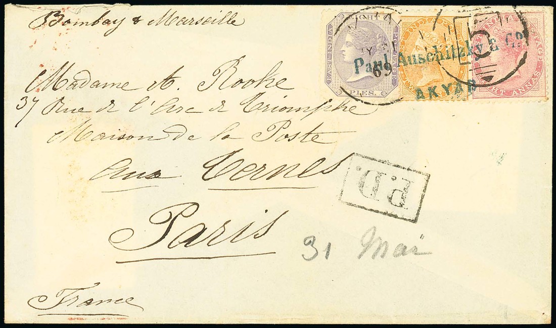1869 (31 July) double rate envelope from Akyab to Paris, marked "Bombay & Marseilles", bearing De La Rue 8p. mauve, 2a. orange and 8a. pale carmine tied by firm's chop in blue and "akyab/5" (Type KD6), showing framed "p.d." with, on reverse, Calcutta and arrival datestamps. An attractive three colour franking. Photo