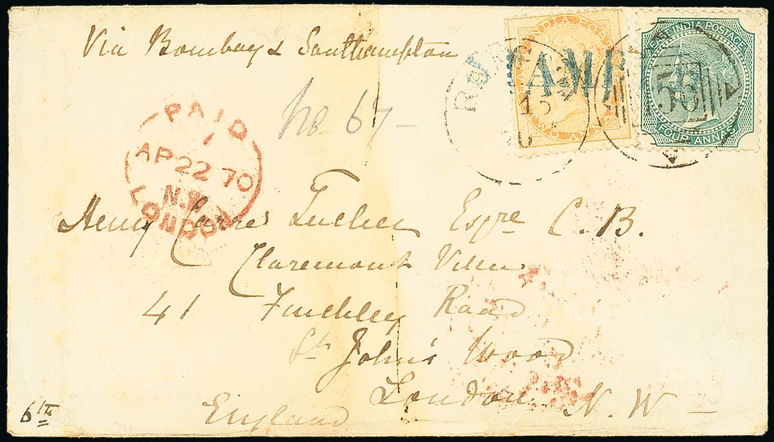 1870 (15 Mar.) envelope from Rangoon to London, marked "Via Bombay & Southampton", bearing De La Rue 2a. yellow and 4a. green tied by "rangoon/156" (Type KD10), showing red Paid arrival c.d.s. (22.4) with Calcutta transit c.d.s. on reverse; the face panel with some light discolouration. Photo