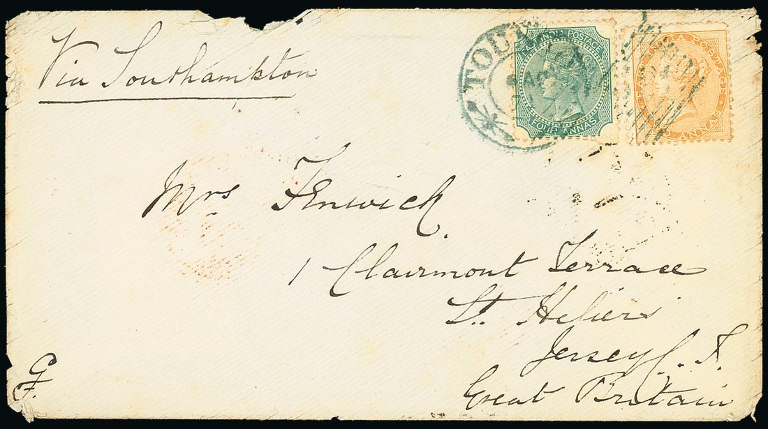 1871 (6 Apr.) envelope from Toungoo to Jersey, marked "Via Southampton", bearing De La Rue 2a. orange and 4a. green tied by "toungoo/181" in blue (Type KD4) and showing, on reverse, Calcutta and arrival (27.5) datestamps; the envelope with part flap missing and some minor peripheral faults. Photo