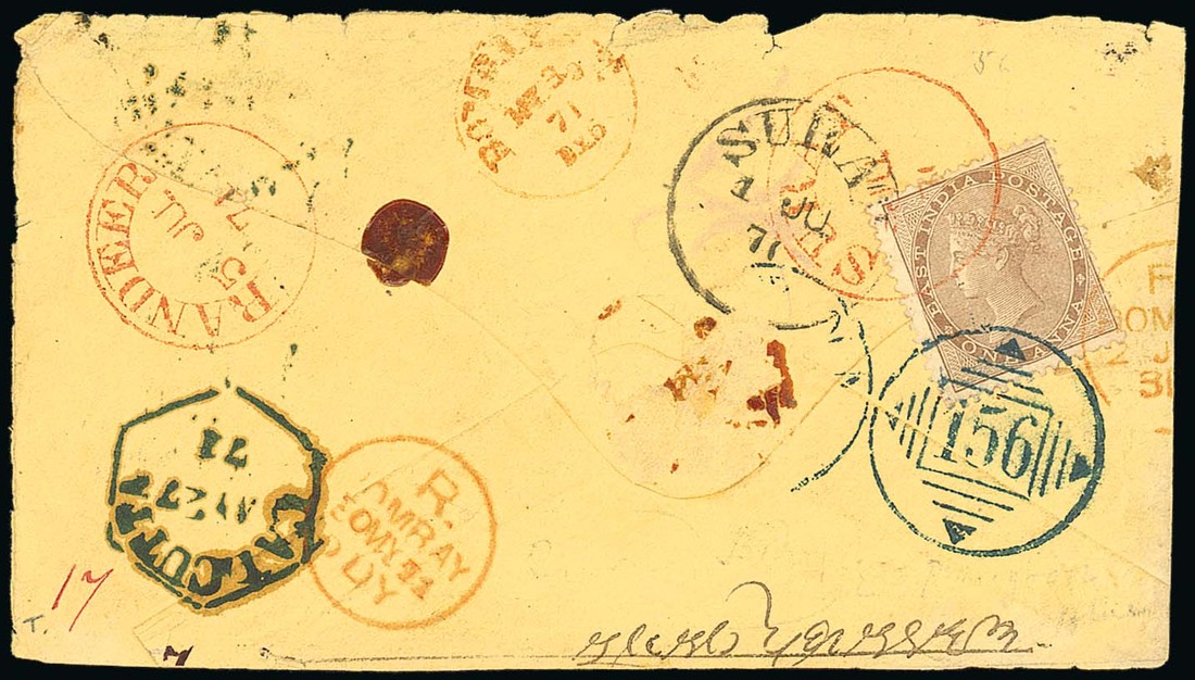 1871 (May) envelope from Rangoon to India bearing, on reverse, De La Rue 1a. brown tied by "rangoon/156" in blue (Type KD10; part missing as originally partly applied over wax seal which is now missing) and Surat transit c.d.s. in red and in black and showing framed "too late" on face. Photo