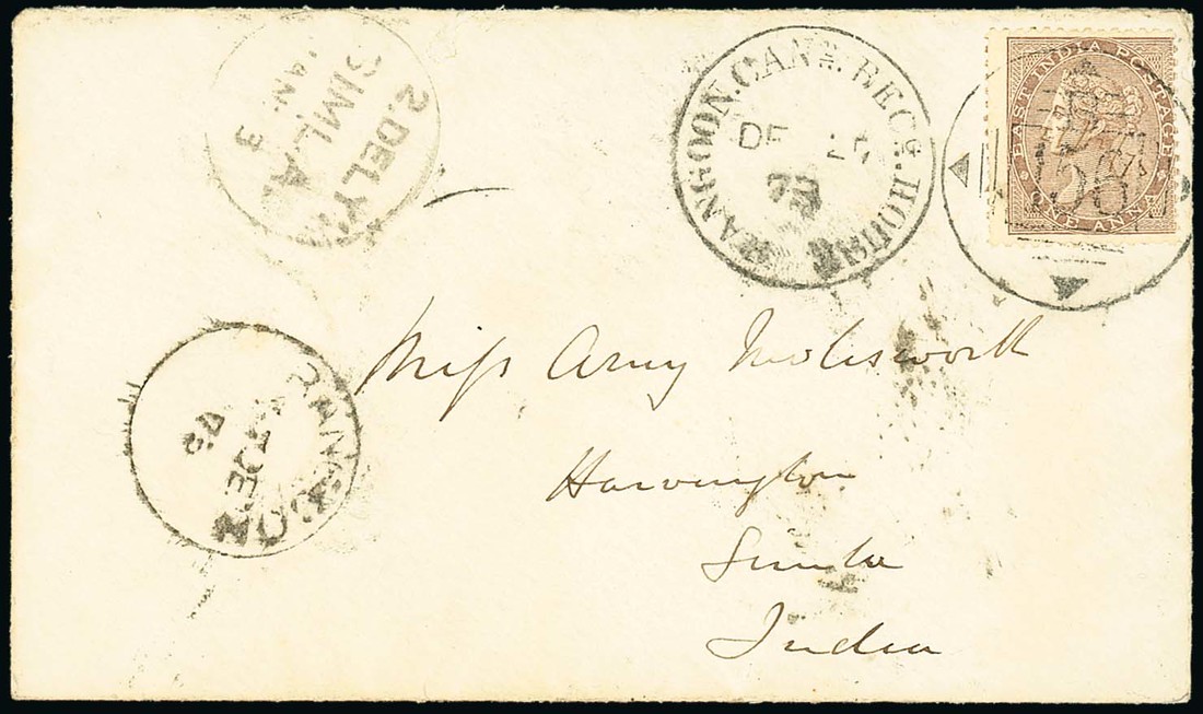1873 (27 Dec.) envelope to Simla, bearing 1a. brown tied by "rangoon cant recg house/b/156" (Type KD2; latest recorded date), showing sans-serif "rangoon" c.d.s. and Simla Delivery datestamp. A great rarity. Photo