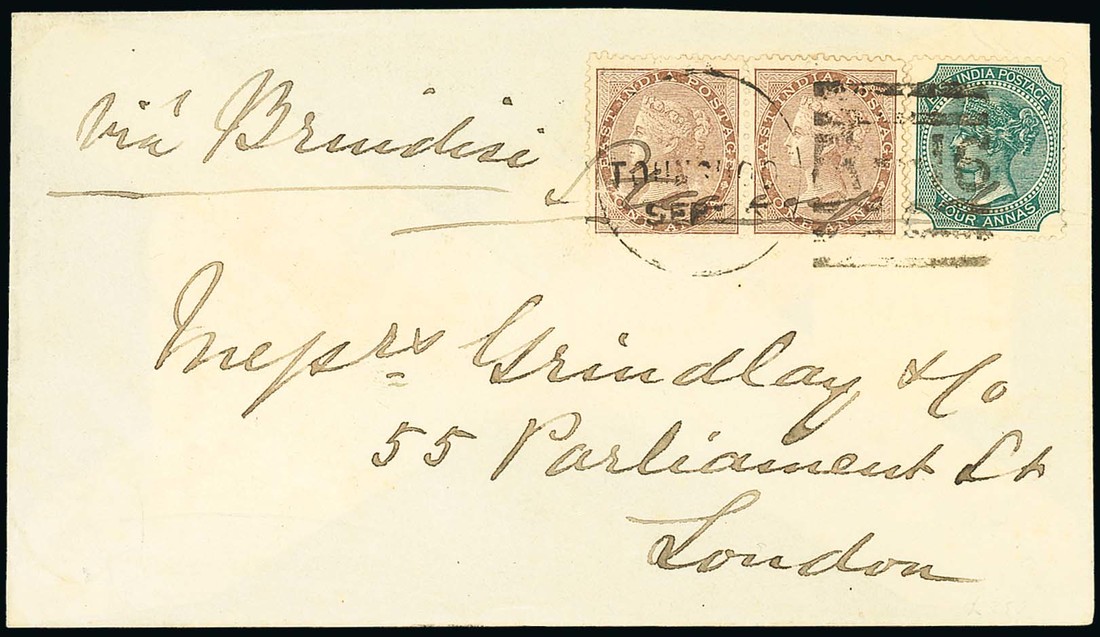 1876 (Sept.) envelope to London, marked "via Brindisi", bearing De La Rue 1a. brown pair and 4a. green crossed by manuscript "Stamped" and tied by "tounghoo/r-16" (Type KD5) and showing, on reverse, Calcutta and arrival (30.10) datestamps. A fine and neat franking. Photo