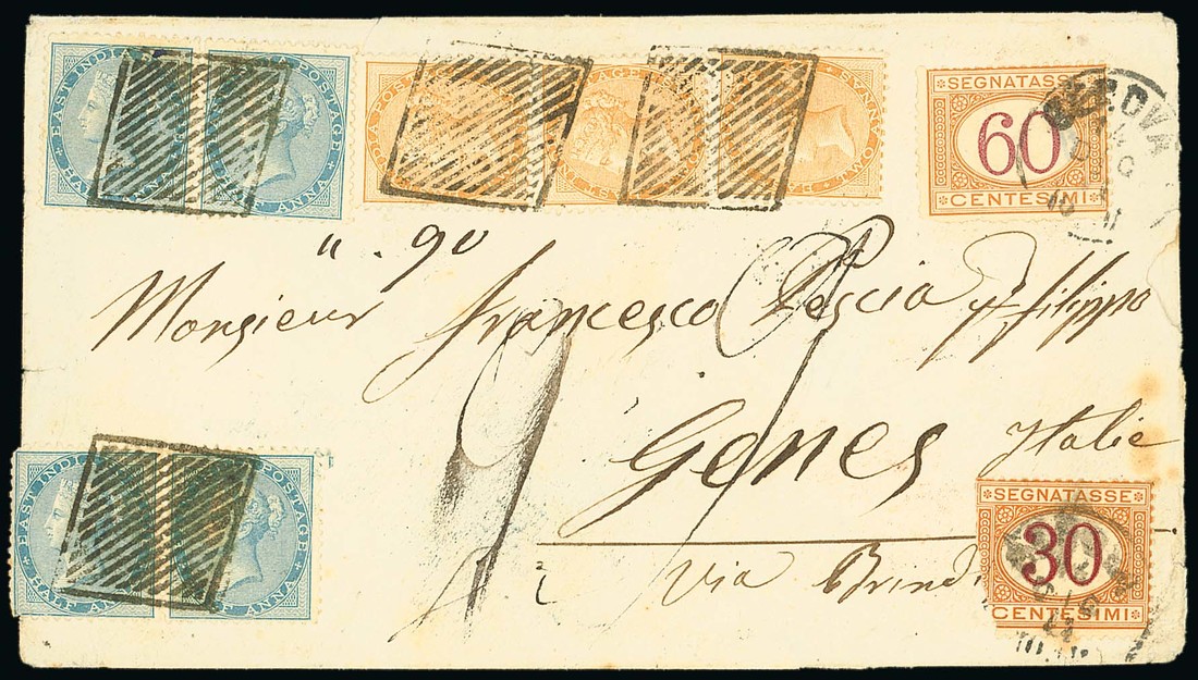 1871 (Nov.) envelope ex the "Pescia" correspondence to Genoa, marked "Via Brindisi", bearing De La Rue ½a. blue (4, one with small faults) and 2a. orange (3), all clearly cancelled by framed diamond of 18 bars (Type K1), showing manuscript "above ¼oz" (on reverse) with Italy 1870 Postage Due 30c. (damaged) and 60c. applied and cancelled on arrival and, on reverse, legible "mandalay" c.d.s. in red, Calcutta, Brindisi and arrival datestamps; the envelope with tear through back flap. A rare and attractive franking, being one of only about six recorded covers. Photo