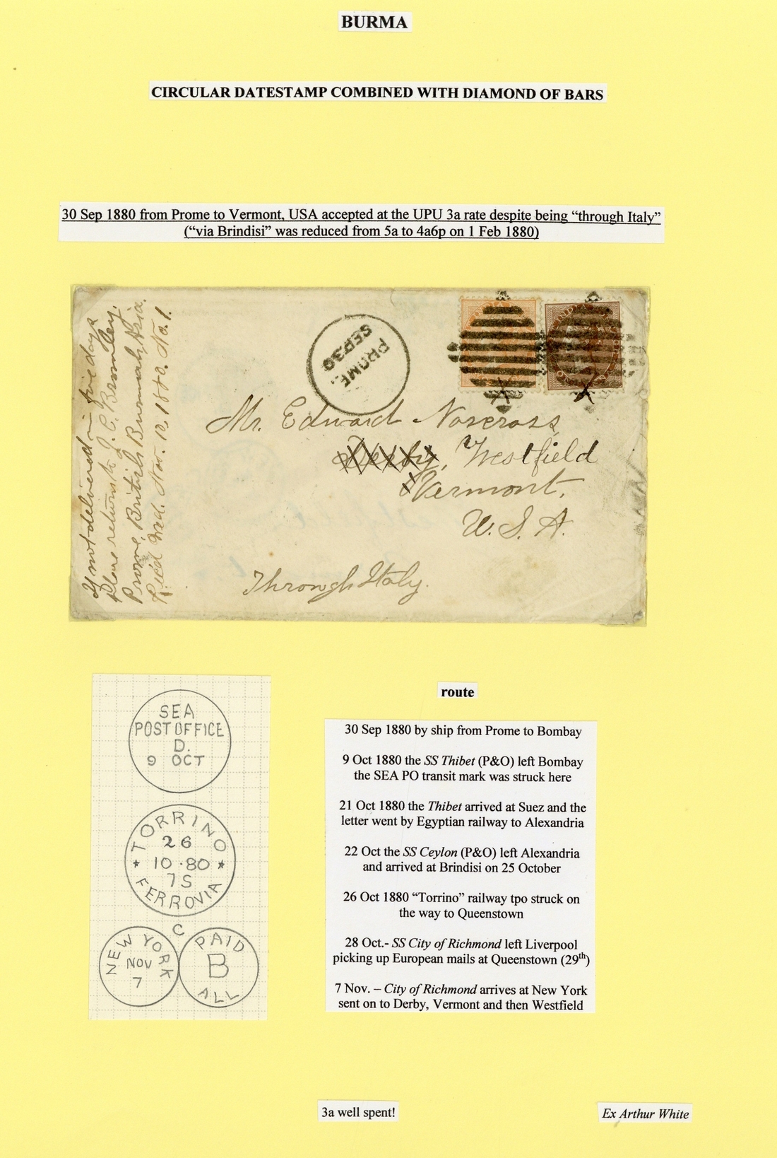 1874 (17 May) envelope registered to Calcutta bearing, on reverse, De La Rue ½a. blue and 4a. green tied by diamond of bars and showing "prome" c.d.s. (Type D4) and Type R2 registration d.s. alongside; 1875 (27 May) envelope (one corner with piece missing) registered to Calcutta bearing, on reverse, De La Rue 1a. brown and 4a. green tied by diamond of bars and showing "rangoon" c.d.s. and Type R5 registration h.s. alongside; 1880 (30 Sept.) envelope to Vermont, bearing De La Rue 1a. brown and 2a. orange tied by diamond of bars and showing "prome" c.d.s. (Type D5) alongside; 1882 (2 Aug.) envelope to Cheltenham, bearing De La Rue ½a. blue (defective) and 4a. green tied by diamond of bars and showing "tounghoo" c.d.s. (Type D6) on reverse; 1885 (9 June) envelope to Surrey bearing 1866 4a. and 1882 ½a. tied by diamond of bars and showing "cantonement/rangoon" c.d.s. (Type D4) on reverse; 1885 (1 Oct.) envelope (roughly opened at left) to Bombay bearing 1882 ½a. green tied by diamond of bars and "moulmein" c.d.s. A good group