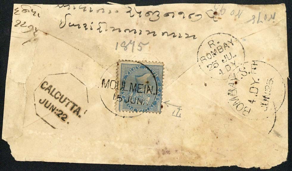 Undated envelope (faults) to Bombay bearing, on reverse, De La Rue ½a. blue tied by fine "moulmein" c.d.s. (Type D7) and showing Calcutta and arrival datestamps alongside