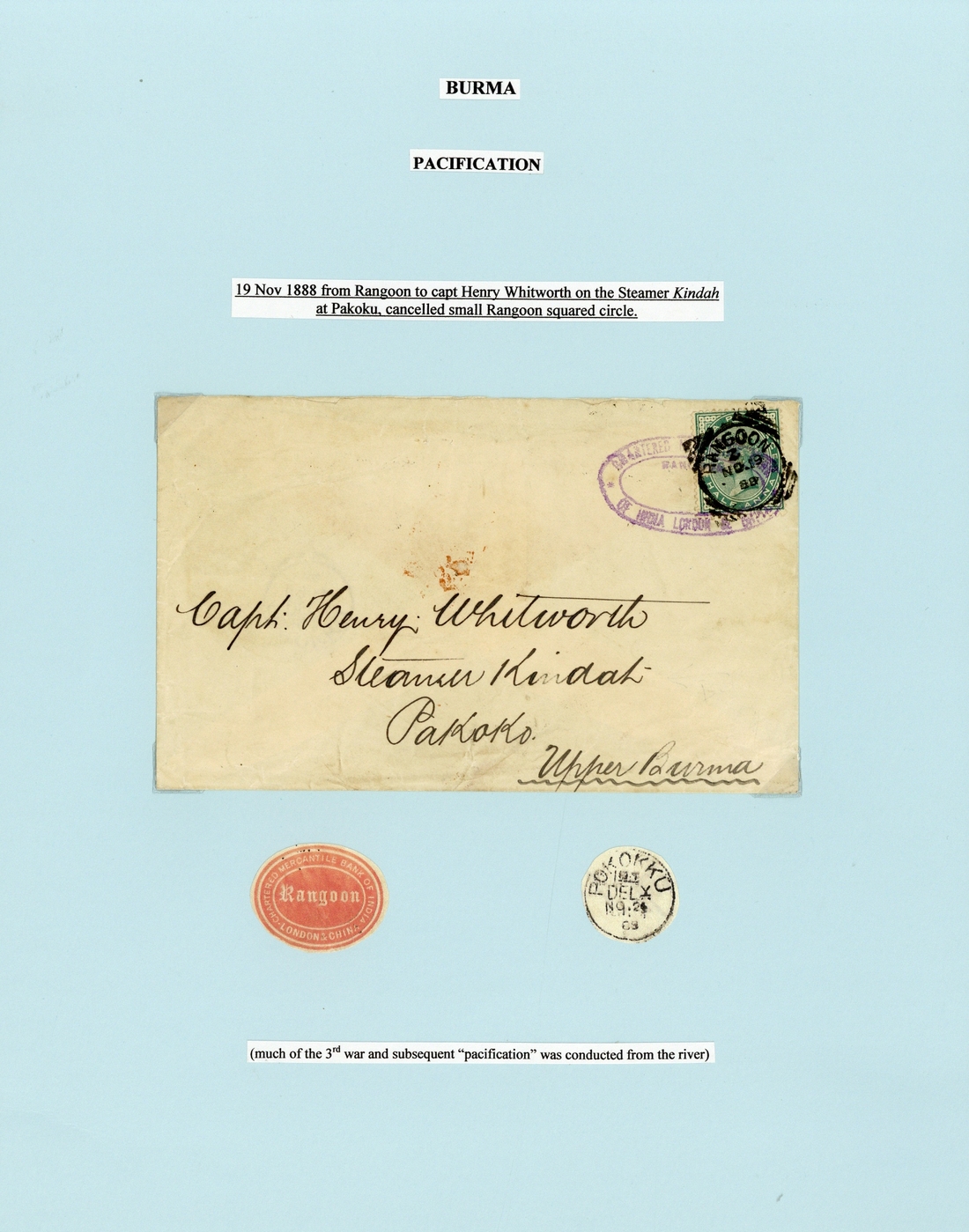 1888 (19 Nov.) envelope addressed to an Officer on the Steamer Kindah at Pakoku, bearing 1882 ½a. tied by firm's oval chop in violet and Rangoon squared-circle d.s. and showing arrival datestamp (24.11) on reverse