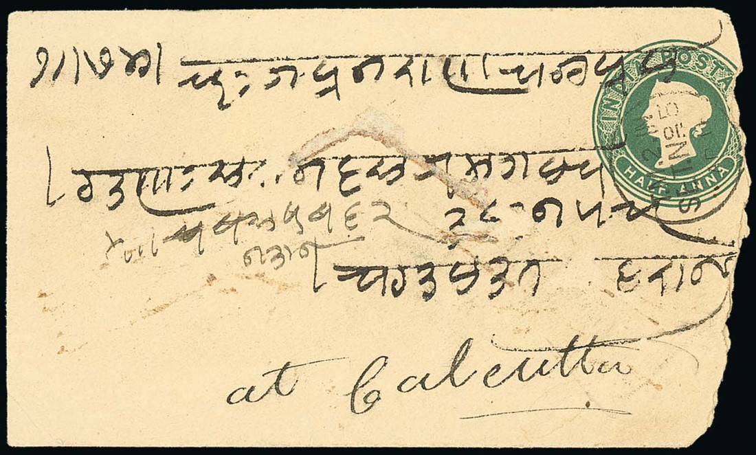 1889 (11 Apr.) ½a. stationery envelope (roughly opened at right) to Calcutta, cancelled by "t.m.2. in/set no 5" c.d.s. and showing, on reverse, arrival datestamp. Photo