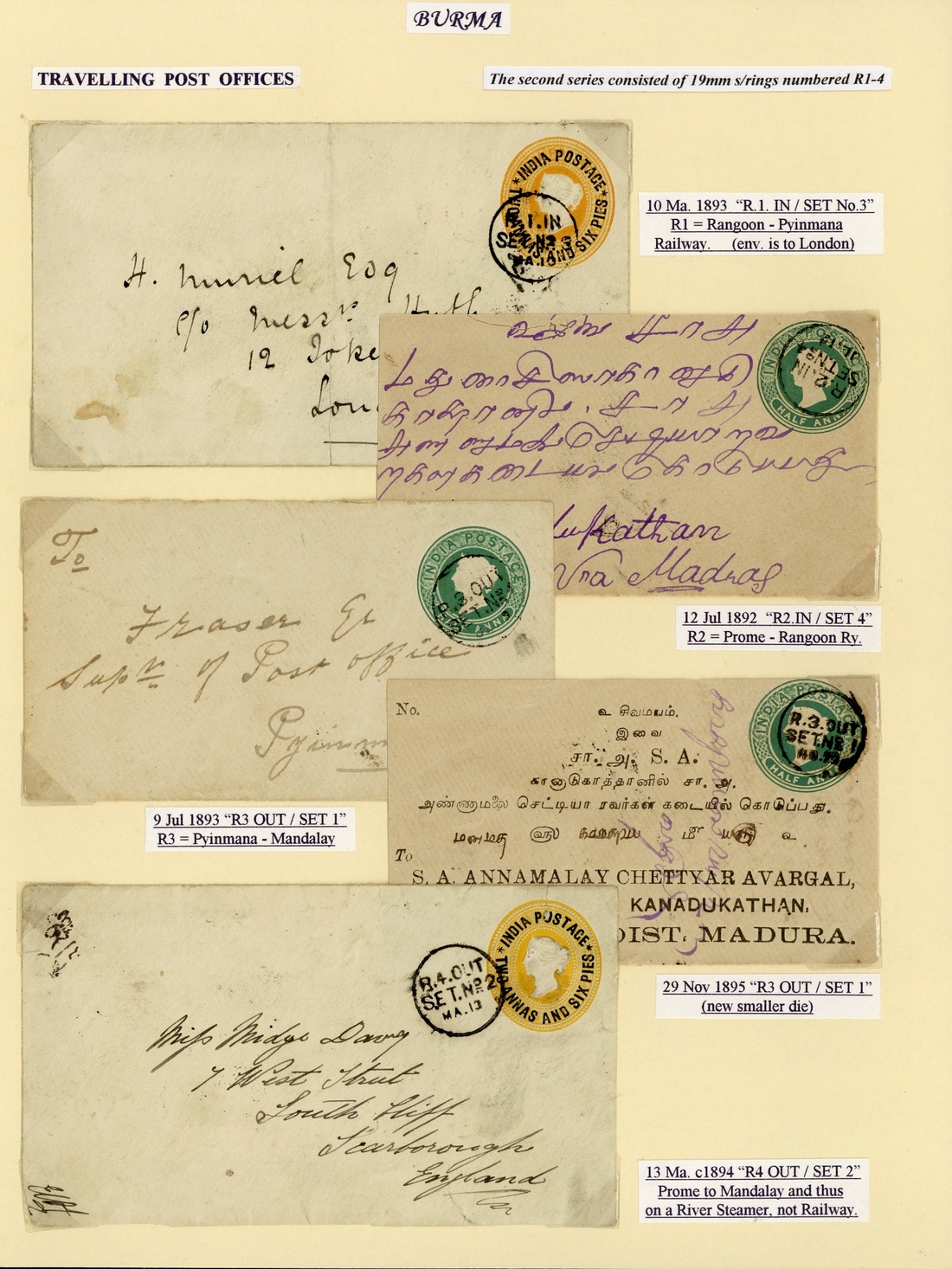1892-1938 envelopes (9), stationery envelopes (15) and cards (3), variously addressed and franked, showing 19mm. single-ring d.s. R1 to R4, 23mm. single-ring d.s. (11) with triangular "passed censor tungoo" with unframed "train letter", river steamer, triangular "posted on wrong train" etc., and later types (11) with oval-framed "late fee/not paid/detained", straight-line "detained. late fee not paid" plus unframed "train letter", "rangoon/train late" datestamps (2 different) and unframed "posted in steamer/letter box". A good lot with much very scarce and an excellent basis for expansion. (26 covers and a piece)