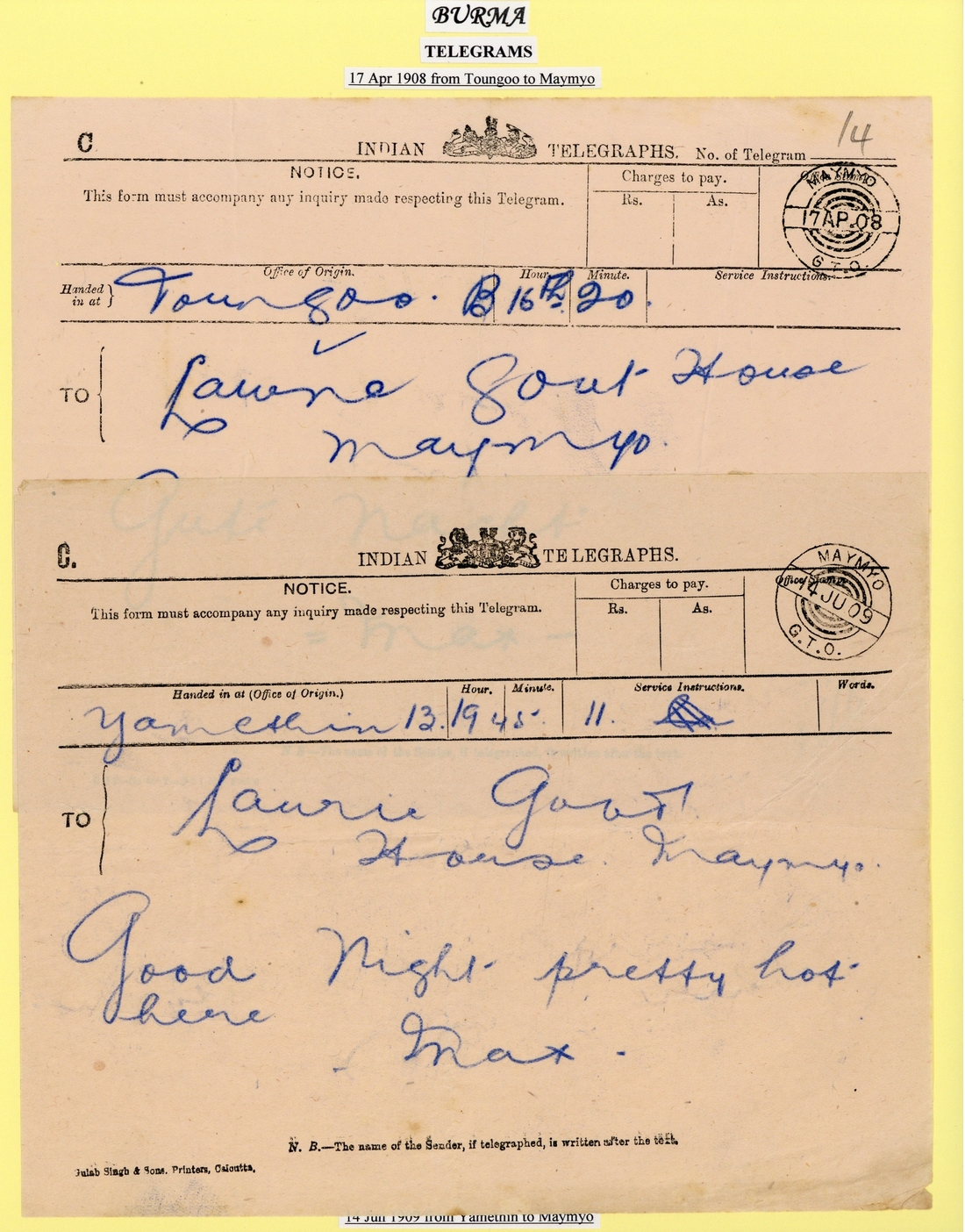 1907-09 Telegrams (13) from Maymyo to Rangoon Cantonment (2) and vice versa, Rangoon to Maymyo (6), Toungoo to Maymyo, Yamethin to Maymyo (2) and to Rangoon