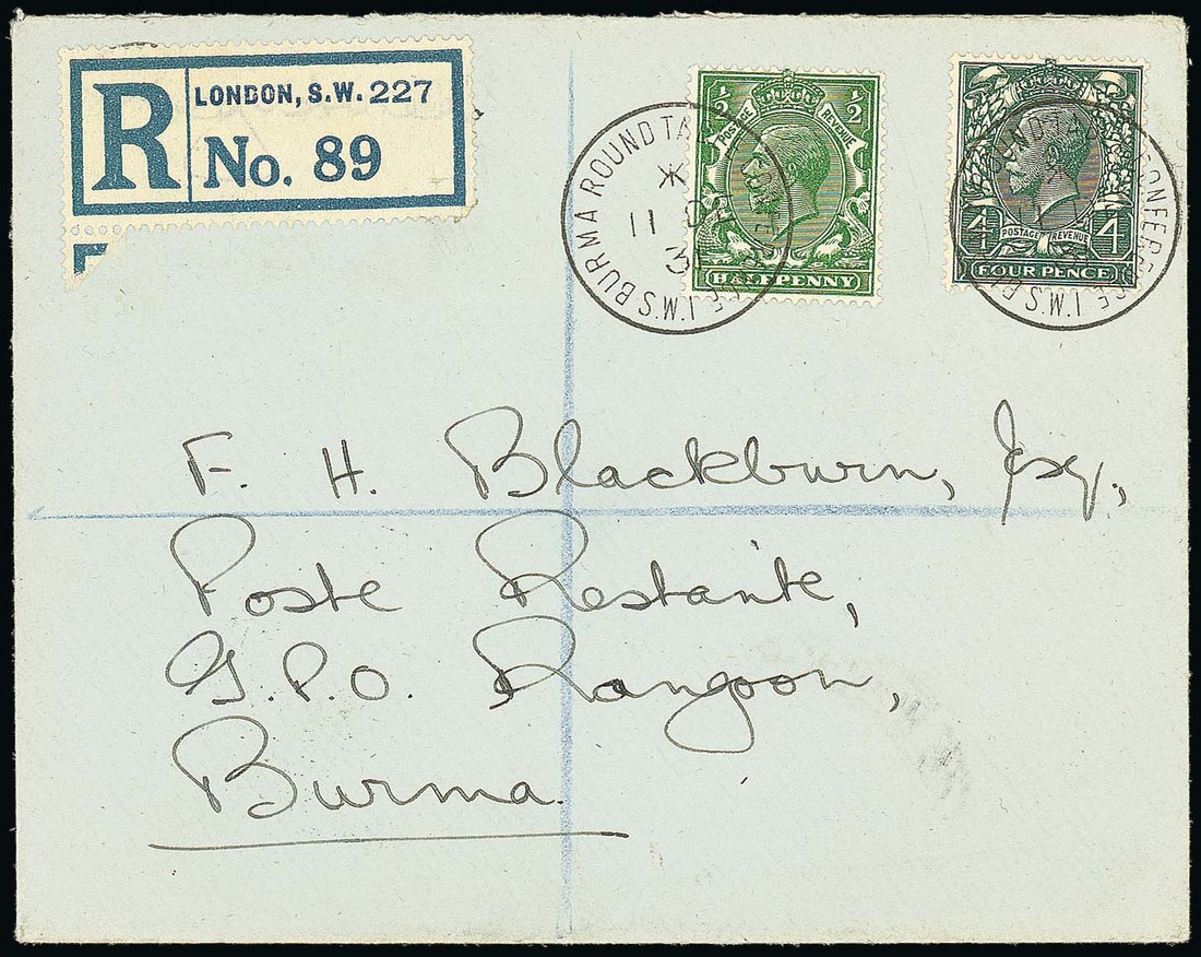 1931 (11 Dec.) envelope registered from London to Rangoon, bearing GB ½d. and 4d. clearly tied by "burma round table conference/s.w.1" c.d.s.; also unstamped envelope posted within London with printed "burma Round Table Conference" at lower left and showing special oval cachet. Scarce. Photo