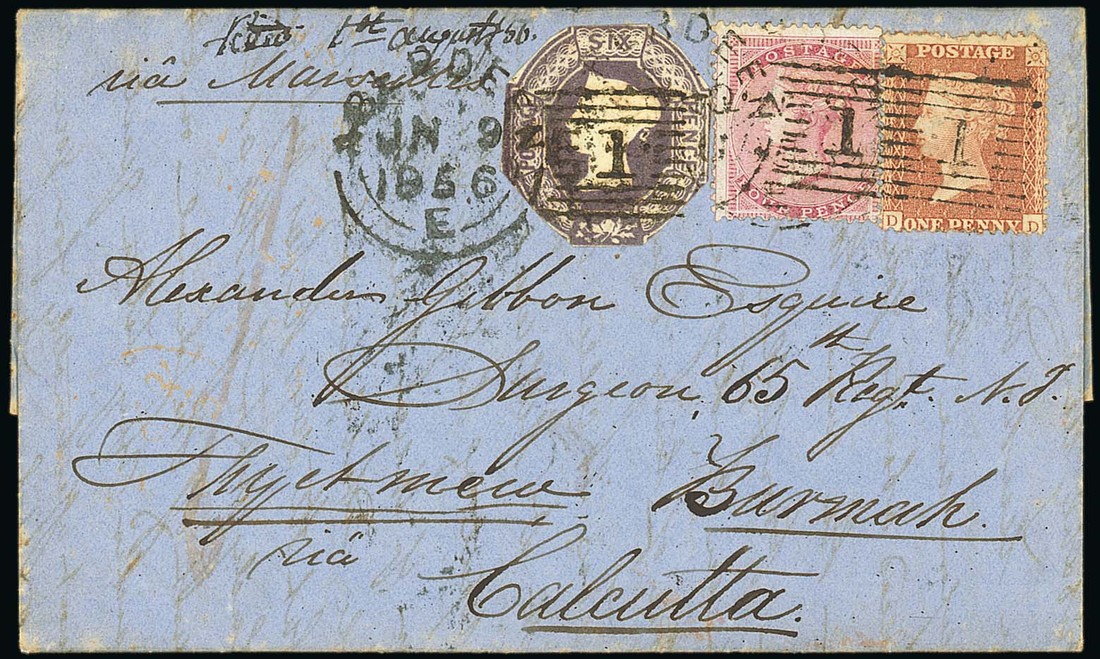 1856 (9 Jan.) entire letter from Aberdeen addressed to a Surgeon in the 65th Regiment at Thayetmyo, marked "via Marseilles", bearing 1d. red-brown (small faults), 4d. carmine and Embossed 6d. (cut to shape), all tied by duplex and showing, on reverse, Calcutta transit d.s. A scarce and attractive franking. Photo
