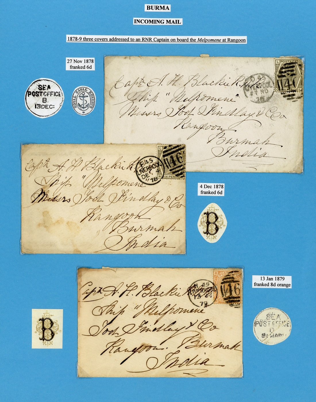 1878 (27 Nov.) and (4 Dec.) and 1879 (13 Jan.) envelopes from Liverpool ex the smae correspondence to an RNR Captain on board the Melpomene at Rangoon, the first two bearing 6d. grey Pl. 16 and the other bearing 8d. orange, all tied by duplex with the first and last showing Sea Post Office transit c.d.s. on reverse; all with some faults