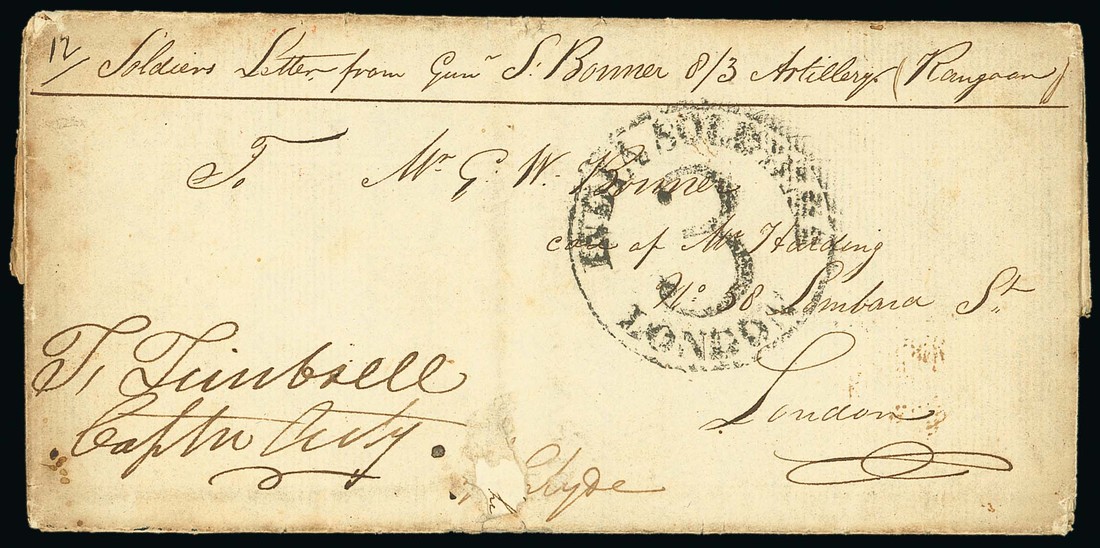 1824 (26 May) "Soldiers Letter from Gunr s Bonner 8/3 Artillery (Rangoon)" to London, countersigned by the Commanding Officer and showing a good strike of the "india soldiers/3/london" circular h.s. (In. Sol. 4), the reverse with Calcutta General Post Office (5.7) and London (11.3) c.d.s.; the cover with small fault at foot, otherwise fine and the earliest known soldier's letter from Burma graphcally describing the capture of Rangoon. Photo