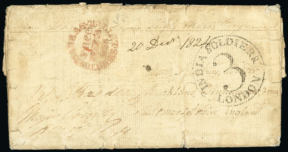 1824 (26 Dec.) entire letter ex the "Saunders" correspondence to Somerset, headed "Lines near Rangoon", countersigned by Commanding Officer, showing "madras/soldiers letter/free" c.d.s. in red, "india soldier &/3/london" (In. Sol. 5 - scarce) and, on reverse, framed "Poonamullee/post free" across join. Somewhat soiled and battered though with fascinating contents regarding the fighting, complete with transcript. Photo