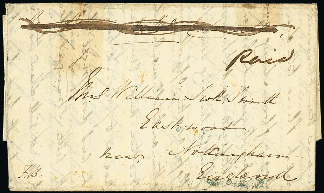 1854 (15 Mar.) entire letter from a member of the 29th Regiment at Moulmein addressed to his mother near Nottingham, marked "by Ship via Calcutta" but this was deleted as it was privately carried by another member of the Regiment returning to England because of sickness, showing manuscript "paid" and, on reverse, Tiverton despatch c.d.s. (14.7) and Nottingham arrival d.s.; the face panel with two light patches of adhesive tape staining. The contents refer to continued fighting with reports of the 2nd Madras Fusilier officers being shot near Shoaygyeen. Photo