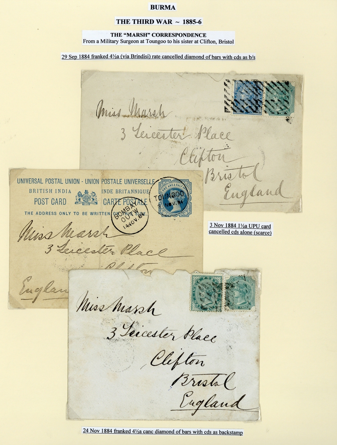 1884 (29 Sept.) - 86 (20 May) envelopes (4, all with letters and transcripts) and 1½a. stationery card ex the "Marsh" correspondence to Bristol, the envelopes each franked at 4½a. and cancelled by diamond of bars or "R" in circle of bars (the last), the card cancelled by "toungoo" c.d.s.; condition a little mixed