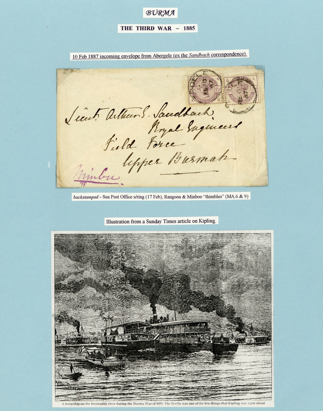 1887 (10 Feb.) envelope ex the "Sandbach" correspondence from Abergele to Minboo, bearing 2½d. pair tied by c.d.s. and showing, on reverse, Sea Post Office, Rangoon and arrival (9.3) datestamps; the envelope with some peripheral faults