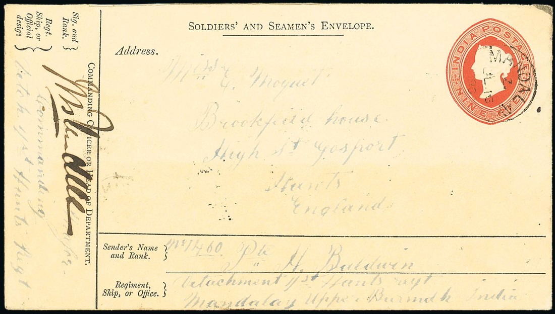 1890 (15 July) Soldier's and Seaman's 9p. envelope from "No. 1460 Pte. H. Baldwin, Detachment 1st Hants Regt Mandalay Upper Burmah India" to England, countersigned by Commanding Officer and cancelled with Mandalay c.d.s.; the reverse with Rangoon (17.7) and Gosport (14.8) c.d.s. Photo