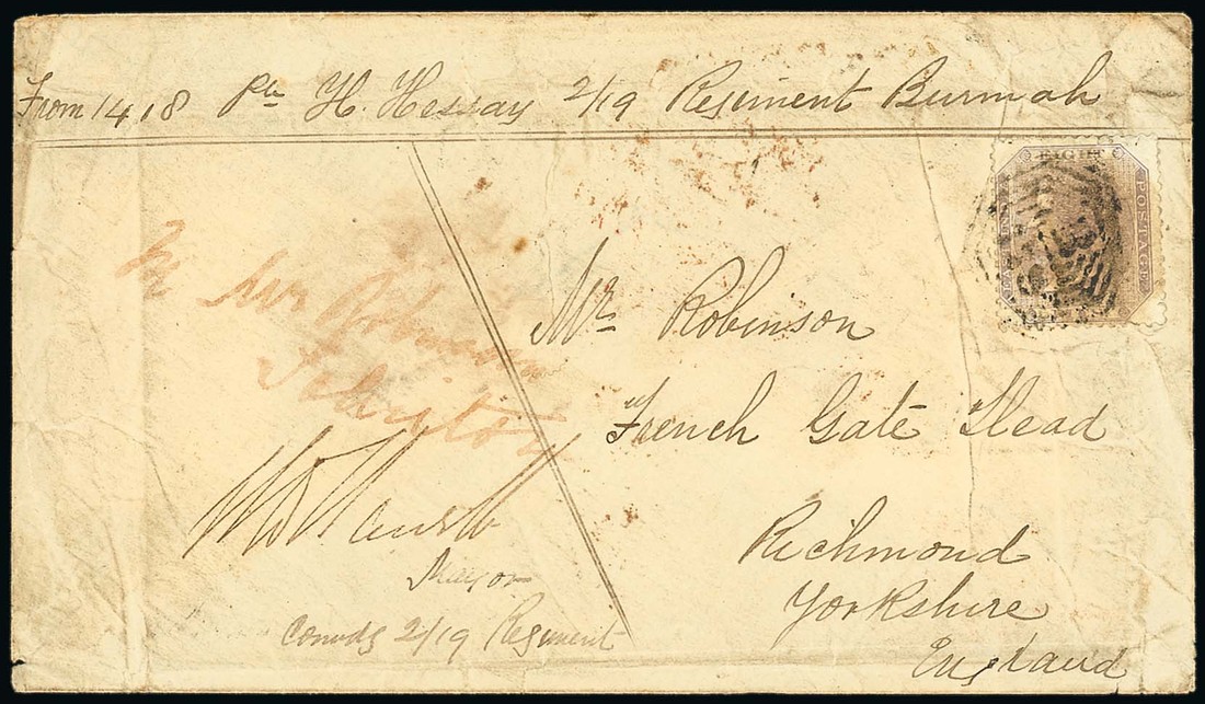 1867 (7 Dec.) envelope "From Pte H. Hessay 2/19 Regiment Burmah" to Yorkshire, countersigned by Commanding Officer, bearing 8p. tied by legible "B/179" and showing, on reverse, "thayetmyoo/p.o." double-ring d.s. in red; the envelope a little creased and soiled. Photo