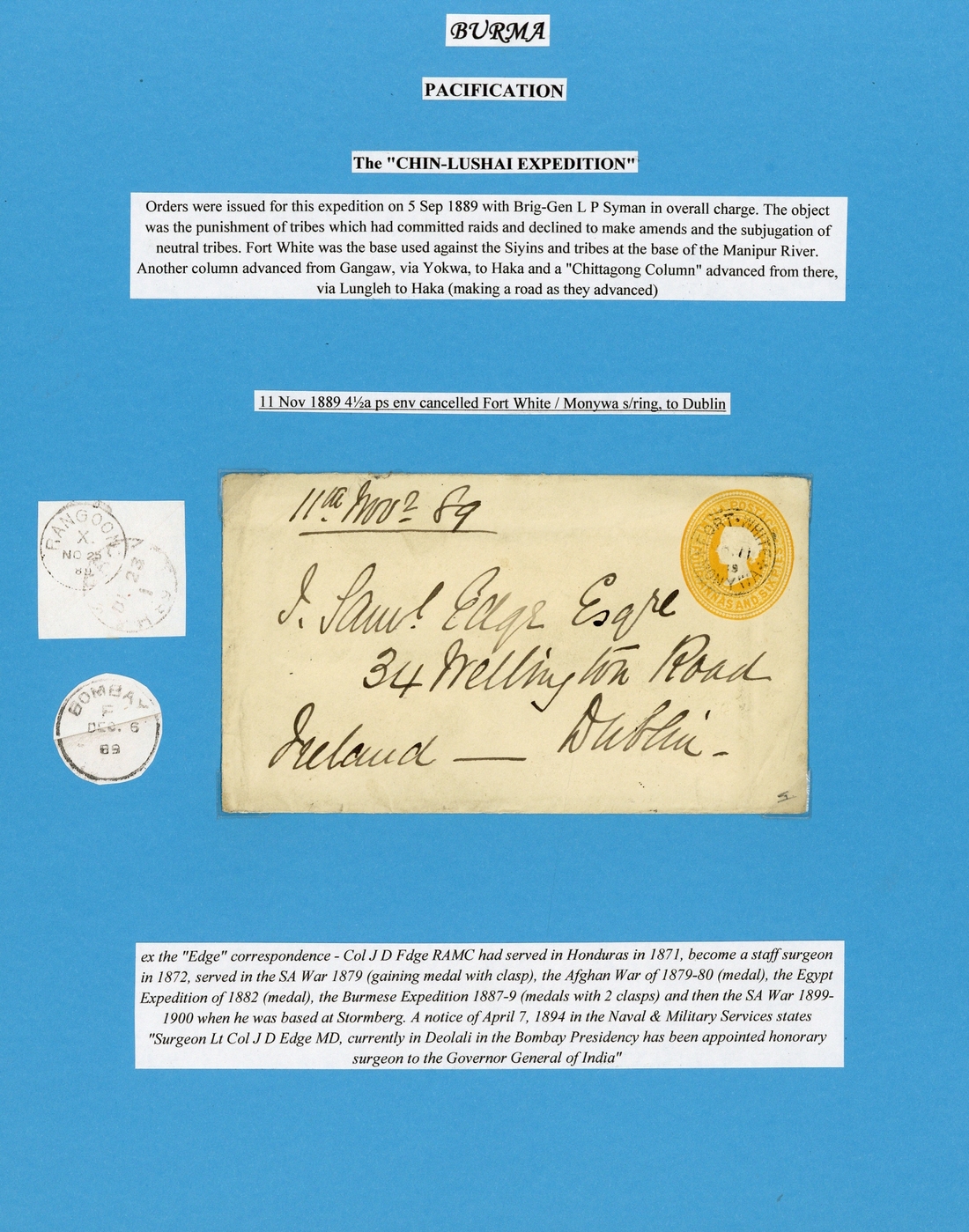 1889 (11 Nov.) 4a.6p. stationery envelope ex the "Edge" correspondence to Dublin, cancelled by light "fort white/monywa" c.d.s. and showing, on reverse, Rangoon (25.11) and Bombay transit datestamps. A fine cover from the Chin Lushai expedition
