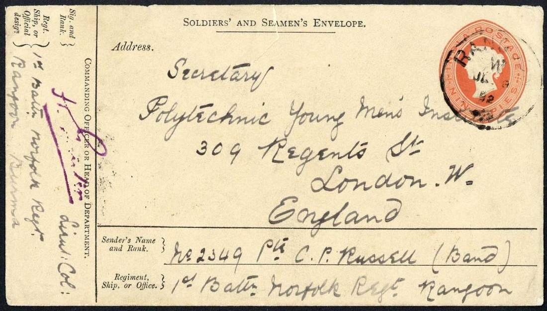 1892 (8 July) Soldiers' and Seamans' 9pi. envelope from "No 2349 Pte C.P. Russell (Band), 1st Battn Norfolk Regt Rangoon", countersigned by Commanding Officer, cancelled by Rangoon c.d.s. and showing Bombay transit d.s. on reverse