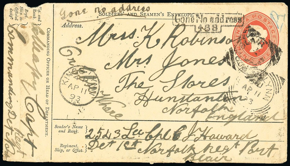 1893 (Mar.) Soldiers' and Seamans' 9p. envelope from "2543 Lce Cpl E Haward Det 1st Norfolk Regt Port Blair" to England, countersigned by Commanding Officer, cancelled with Port Blair squared-circle d.s.; upon arrival the envelope endorsed "Gone no address" and showing framed "gone no address/488" h.s. and with two different King's Lynn d.s. (11.4), the reverse with two further transit c.d.s., London Returned Letter Office c.d.s. (12.40, boxed "d.l.o./bombay" d.s. (5.6) and similar for Rangoon (22.6); small part reverse torn away and with other small faults, nevertheless very rare and full of character. Photo