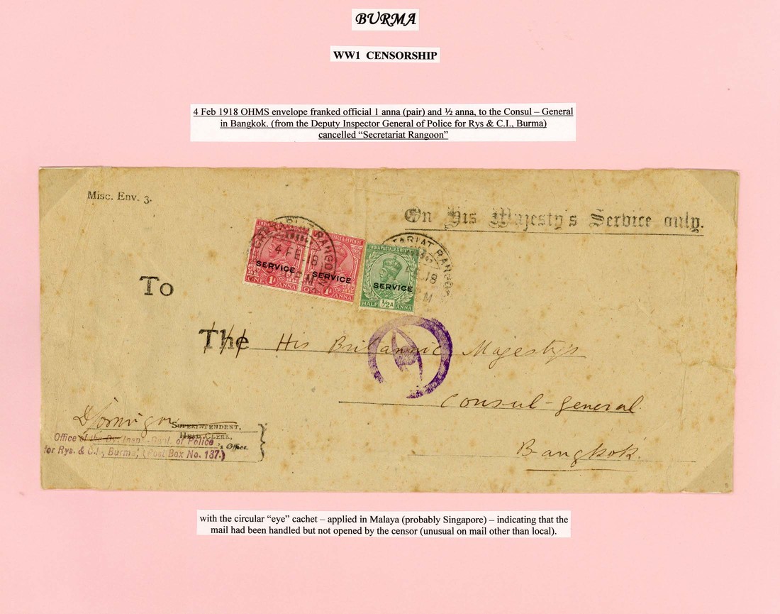 1918 (4 Feb.) OHMS envelope from the Deputy Inspector General of Police for Rys and C.I. to the Consul-General in Bangkok, bearing Official ½a. and 1a. pair tied by Secretariat Rangoon datestamp and showing circular "eye" cachet in violet applied in Malaya
