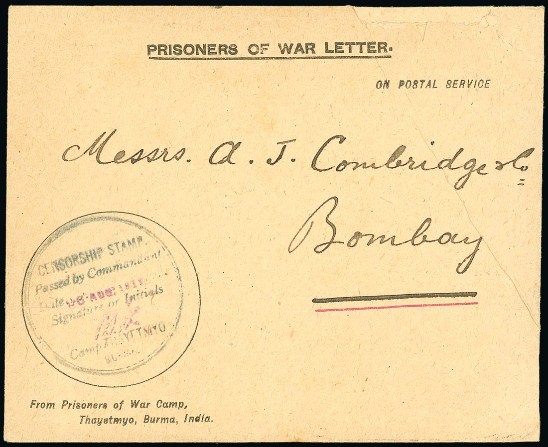 1917 (29 Aug.) P.O.W. printed envelope with "From Prisoners of War Camp, Thayetmyo, Burma, India" at foot, to Bombay, showing fine Commandant's censor h.s. in violet with handstamped date and initials in red; the envelope with crease and some other minor faults. Photo
