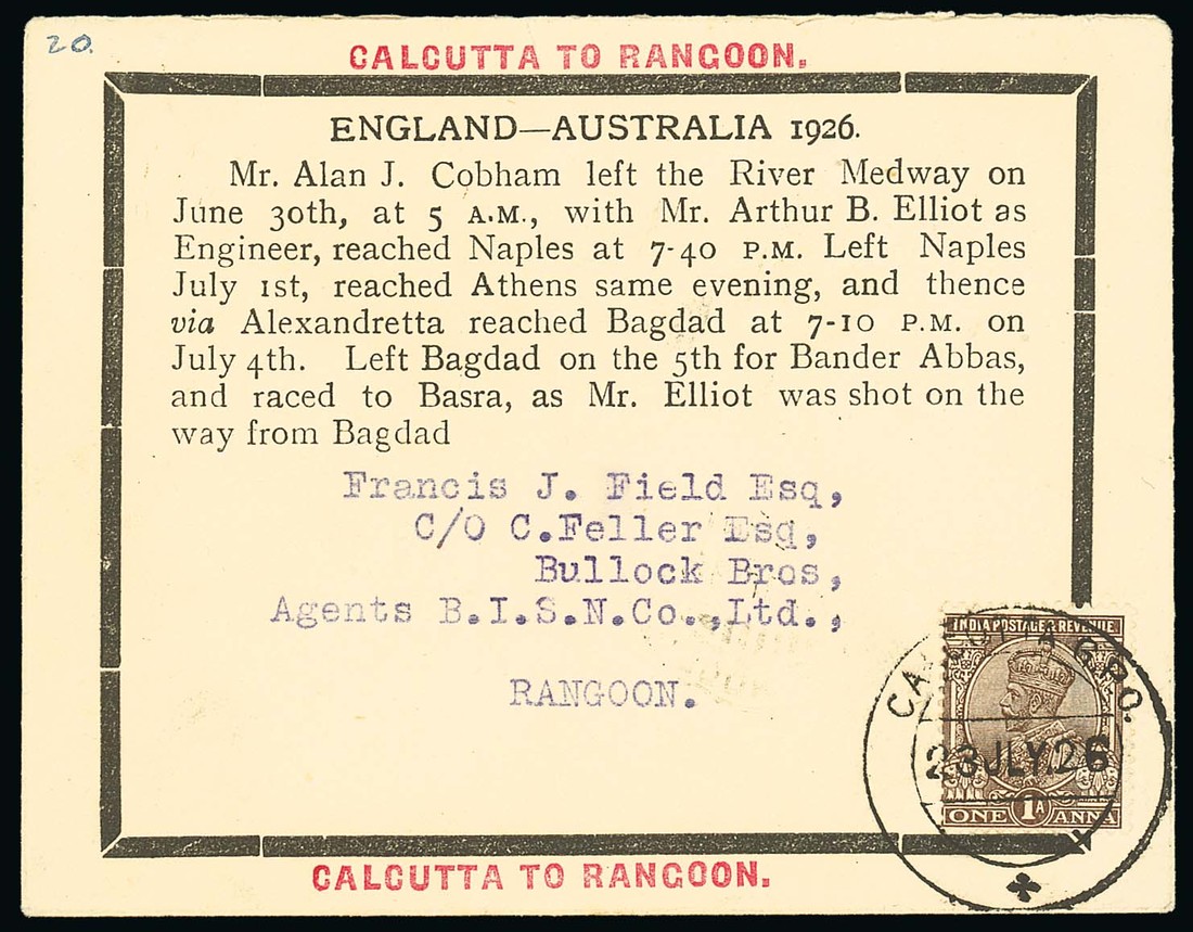 1926 (23 July) England - Australia flight by Alan Cobham, special mourning envelope commemorating Arthur Elliott, carried on Calcutta to Rangoon bearing 1a. cancelled by c.d.s. and showing special photographic vignette on reverse. Photo