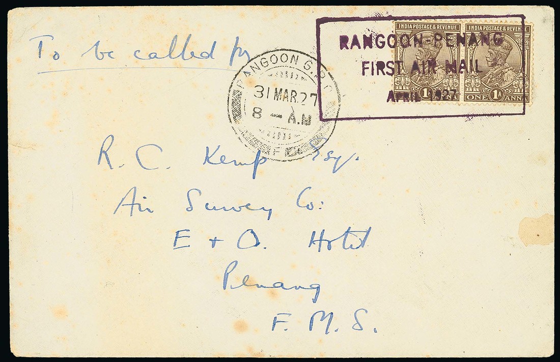 1927 (31 Mar.) Rangoon-Penang First Flight, envelope written by and addressed to R.C. Kemp (partner of F.P. Raynham the pilot, founder of the Air Survey Co.) in Penang, bearing 1a. (2) sharing a fine strike of the framed "rangoon-penang/first flight/april 1927" handstamp in magenta and with Rangoon G.P.O. c.d.s. alongside, arrival datestamp (2.4) on reverse; the envelope with some stains on face though a rare flight. Photo